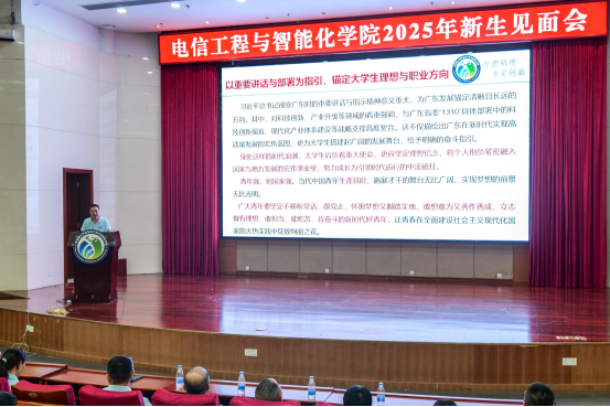 随后,胡院长详细介绍了学院的发展历程、学科建设、师资力量、教学科研成果和未来发展规划。他强调,学院始终坚持以“厚德明理、求是创新”为院训,致力于培养高素质应用型创新人才,并寄语新生树立远大目标、夯实专业基础、积极投身实践、养成良好学习与生活习惯。