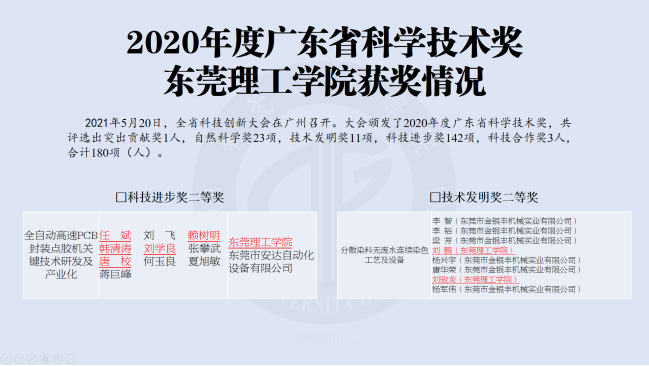 2021年5月20日,全省科技创新大会在广州召开,大会颁发了2020年度广东省科学技术奖。其中,电子工程与智能化学院任斌教授负责的团队项目——由东莞理工学院和东莞市安达自动化设备有限公司完成的“全自动高速PCB封装点胶机关键技术研发及产业化”荣获广东省科学技术奖科技进步奖二等奖,电智学院赖树明高级工程师、韩清涛副教授、刘学良副教授、唐校博士参与该项目。