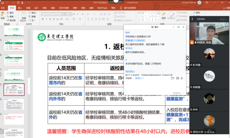我院学工队伍召开学生返校工作会议,集中研读学校的返校政策,学院党委副书记梁意红在会上做工作安排:一是教育前置,在学校统一要求的基础上,结合我院学生特点完善学生返校指引PPT,做好政策解读和教育引导工作;二是精准摸排、建立台账,通过前期学生健康打卡信息做到准确摸清学生返校前14天的行程信息、建立精准台账;三是在学生返校3天中,辅导员实行“一人一岗、一岗双责”,做好服务与管理工作。梁意红还要求辅导员关注疫情走向,清醒把握疫情防控各项措施的动态变化,增强预判能力,掌握工作主动。