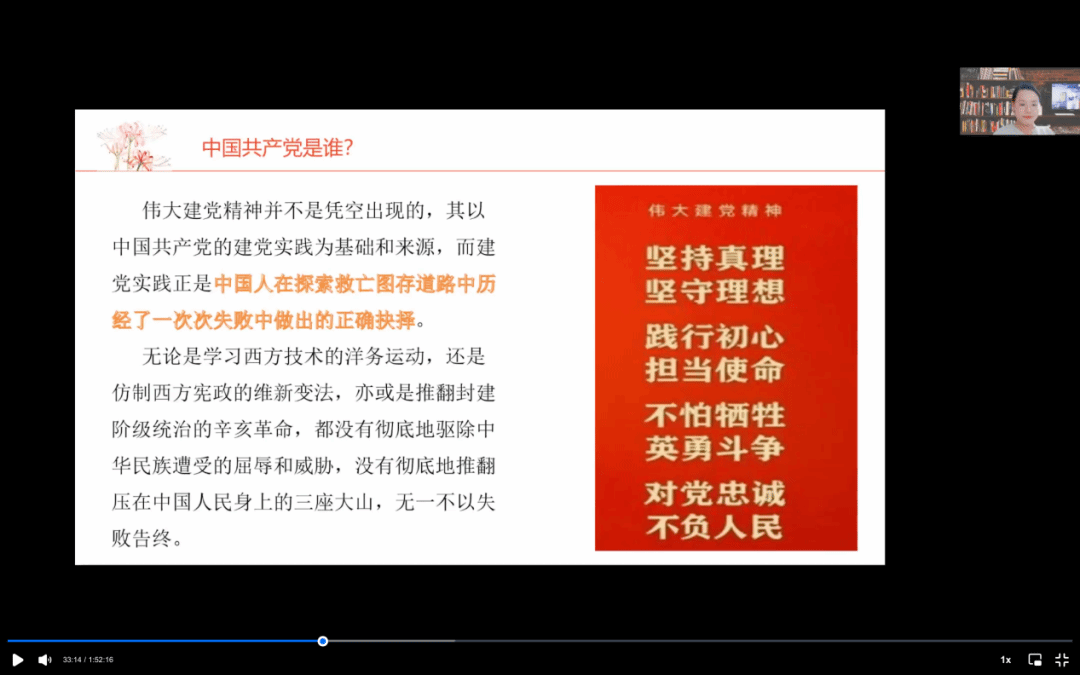 中国共产党是中华民族和中华儿女最坚强的依靠。唐老师结合中国近代史、伟大建党精神介绍中国共产党成立的国内外背景,一代又一代中国共产党人为人民过上更好的生活和实现共产主义不断奋斗。她讲解到:“中国共产党是一个拥有科学的、焕发出强大的力量的指导思想和精神力量的党,党的百年实践证实了马克思主义是党和人民的事业取得巨大成功的力量之源。”