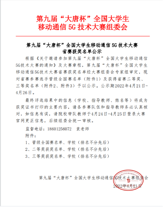 近日,第九届“大唐杯”全国大学生移动通信5G技术大赛省赛获奖名单公布。我院参赛队伍首次参加共获奖23项,其中一等奖4项、二等奖13项、三等奖6项。4支队伍入围国赛。